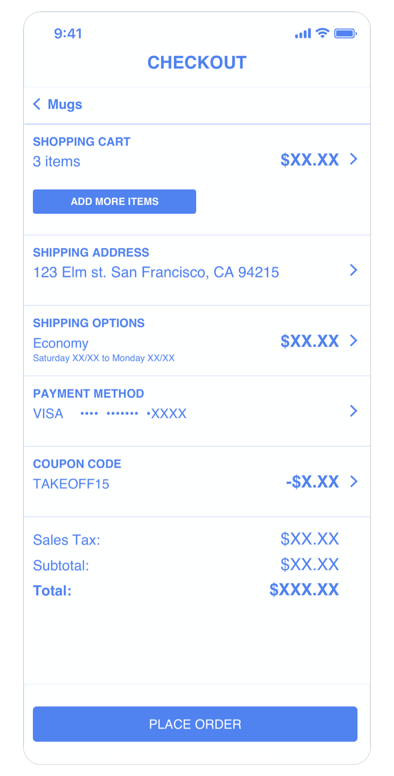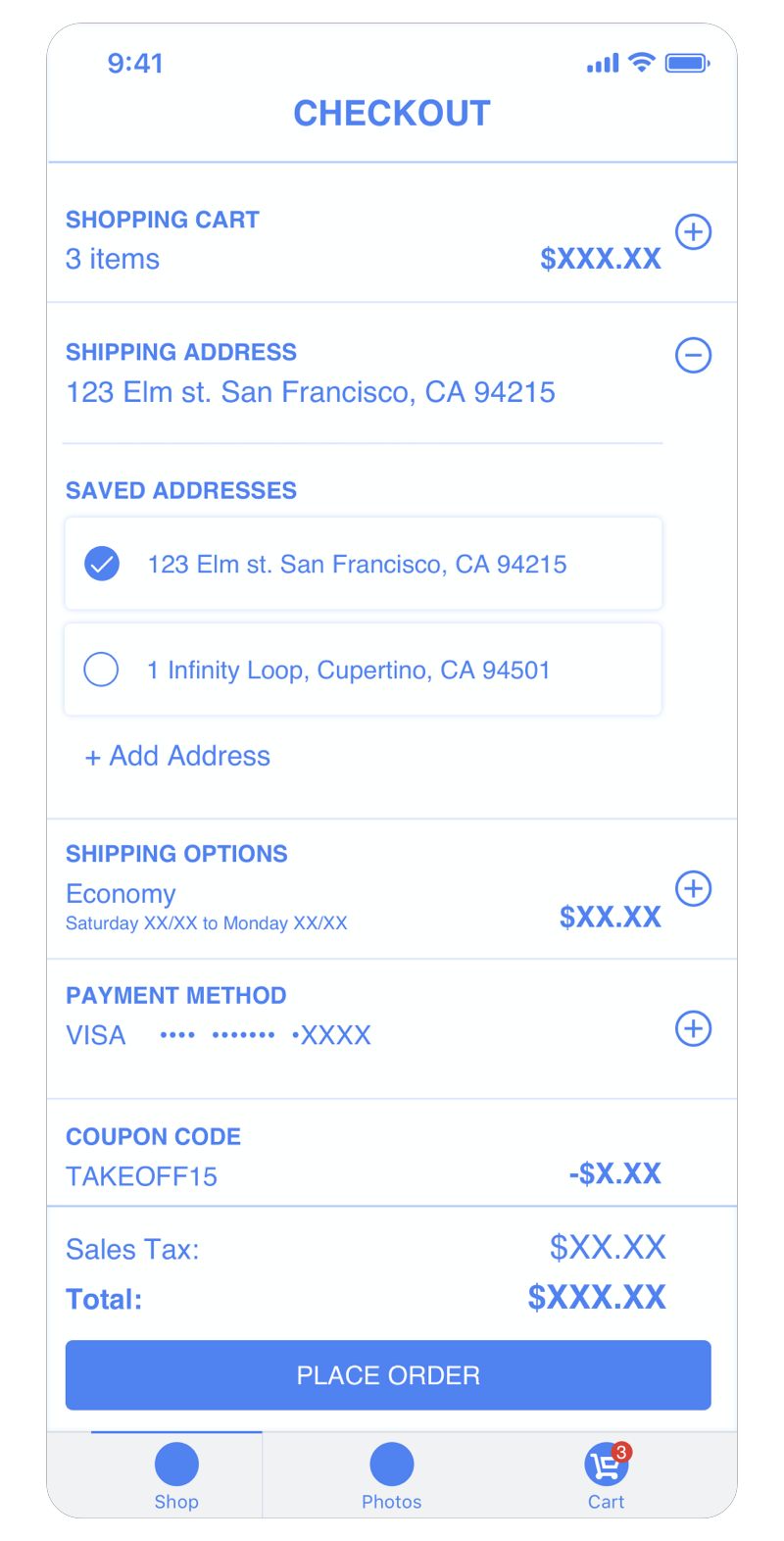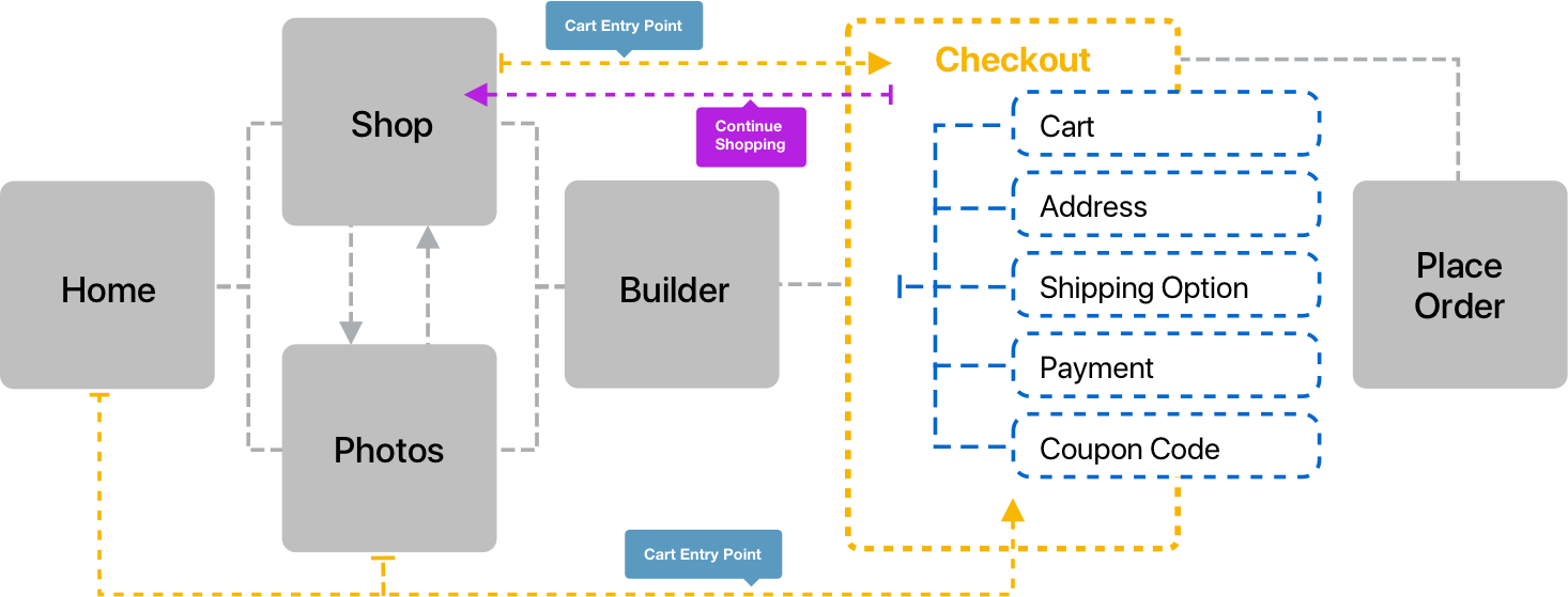 Similar to Shutterfly's drawer type of navigation, checkout components are divided into their respective space.