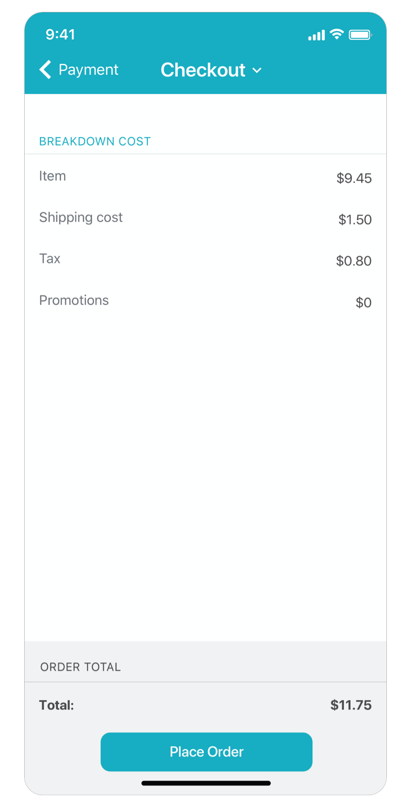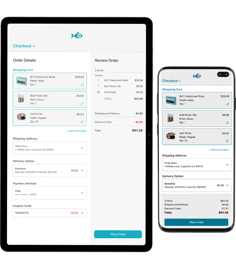 Checkout screen provides breakdown cost of my order. A "Place Order" CTA finalizes my 4x6 Prints transaction.