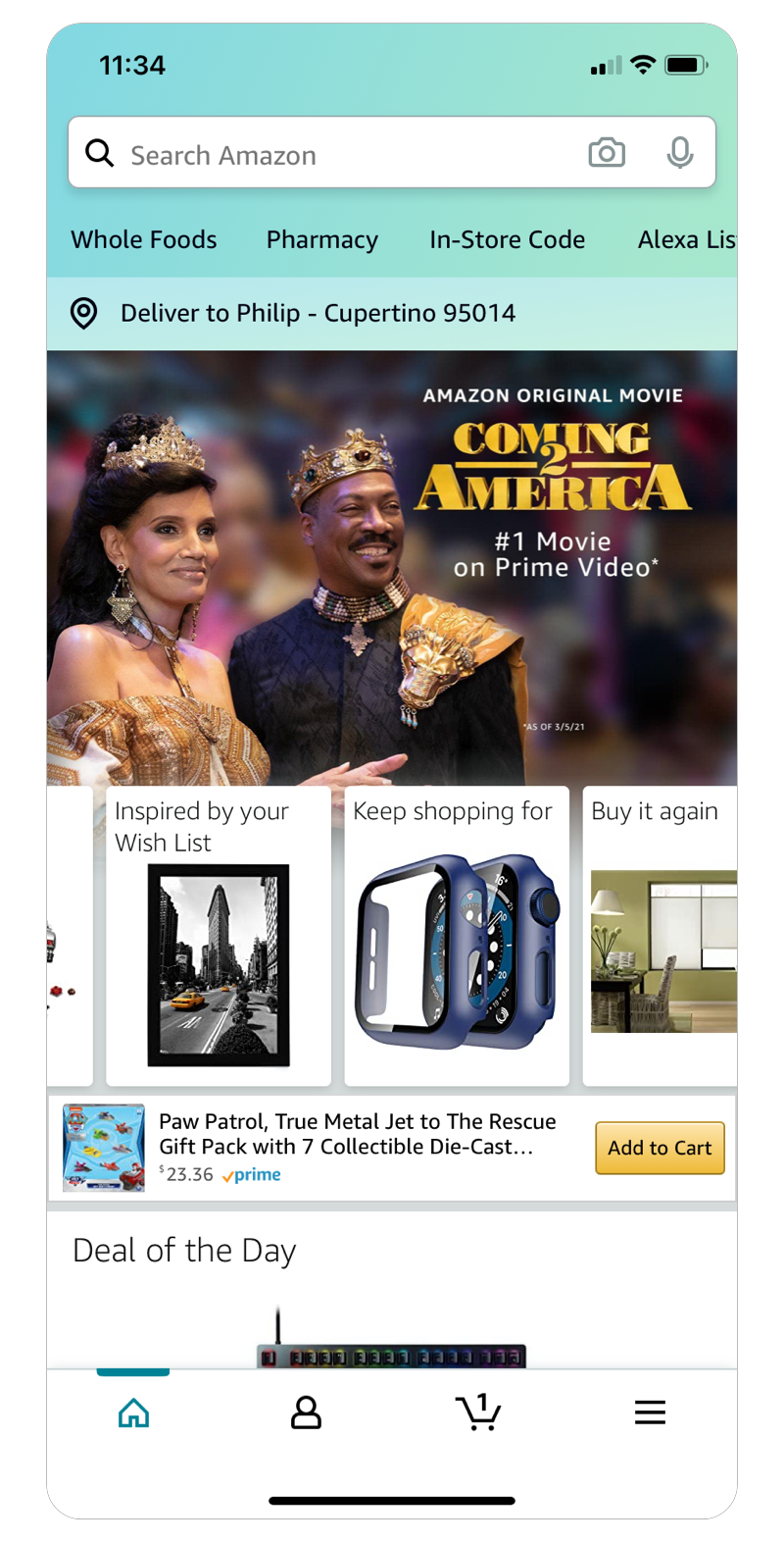 Users have access to cart in certain areas like home screen, while shopping or browsing through photos.