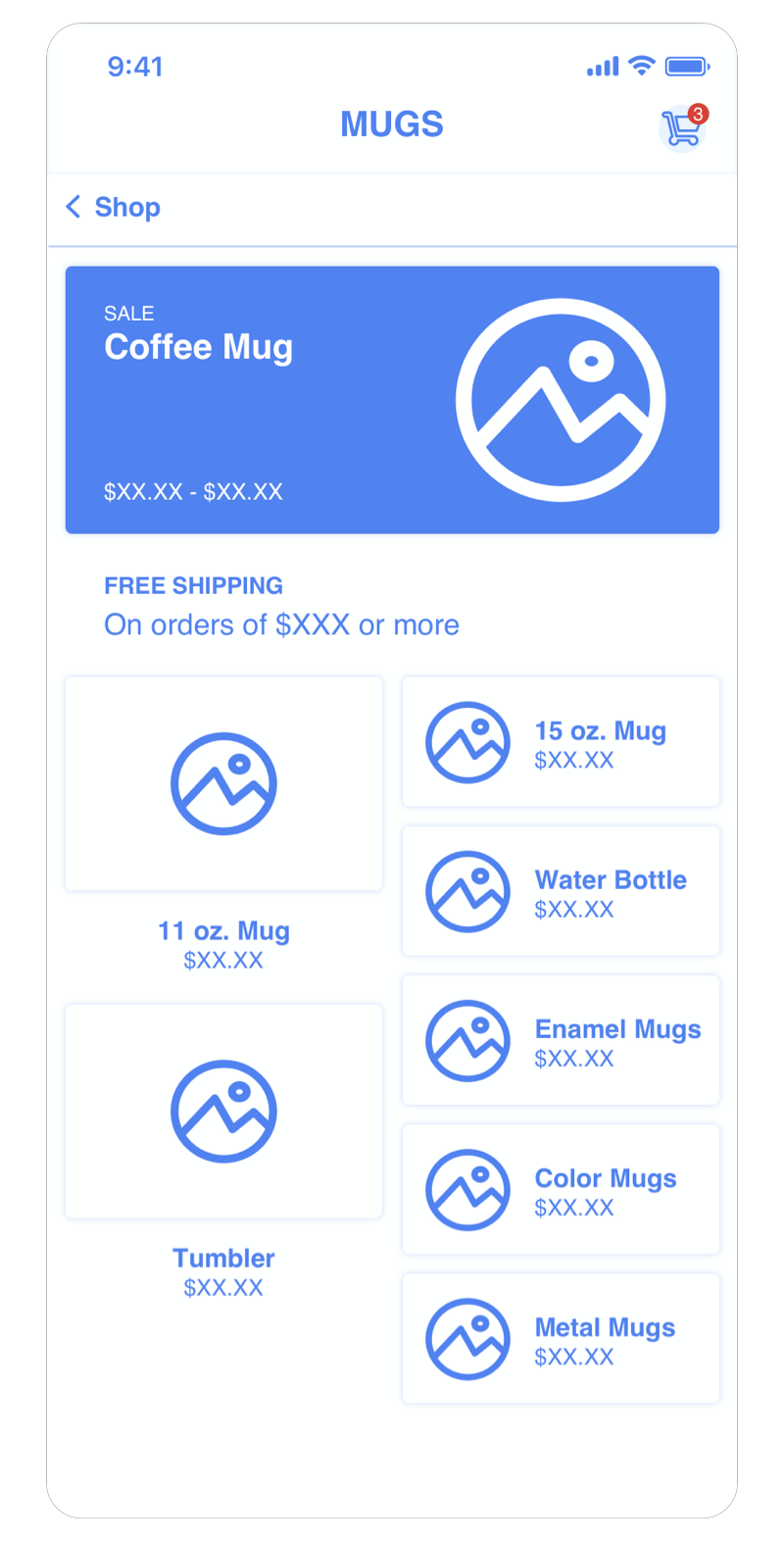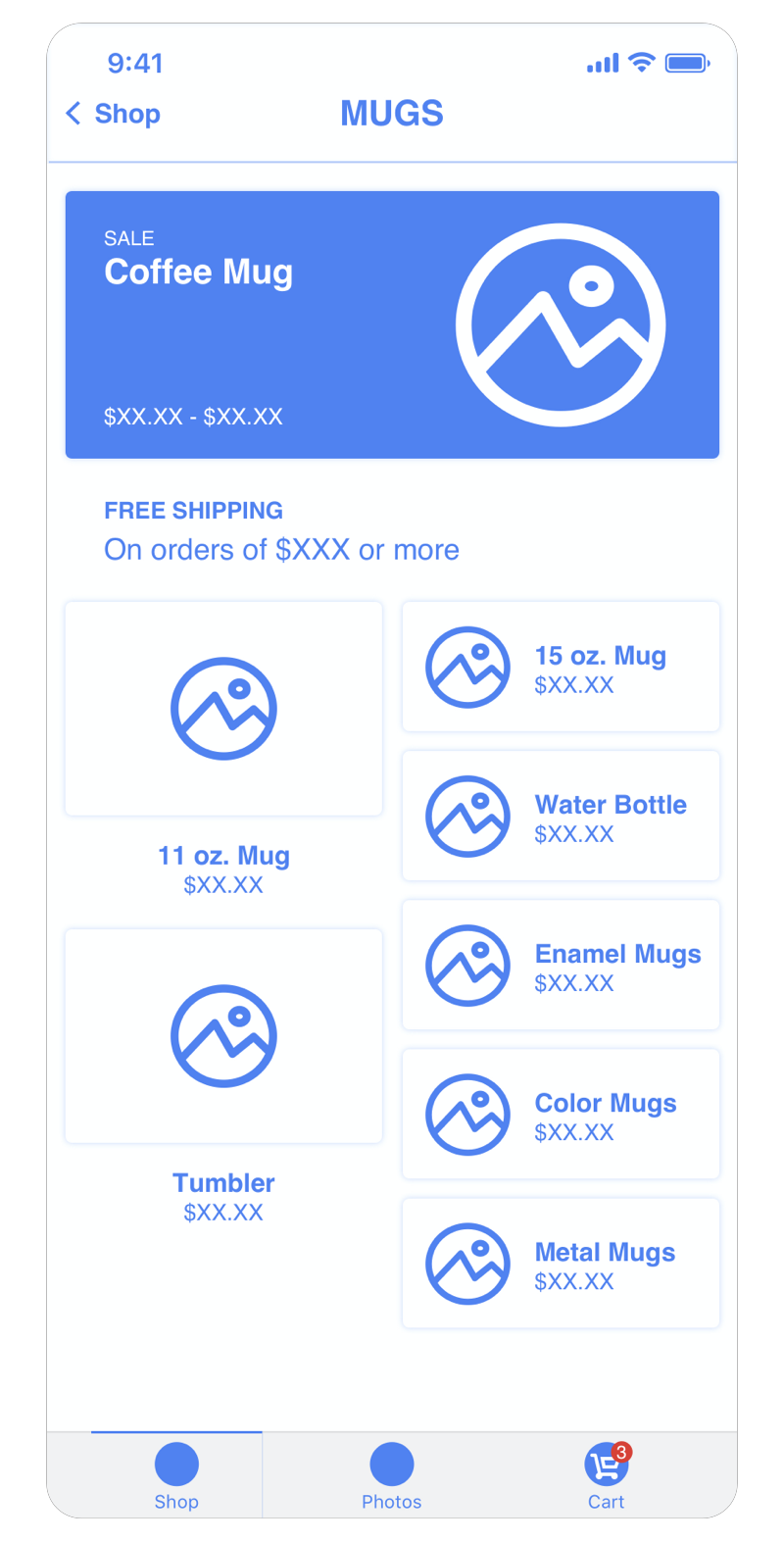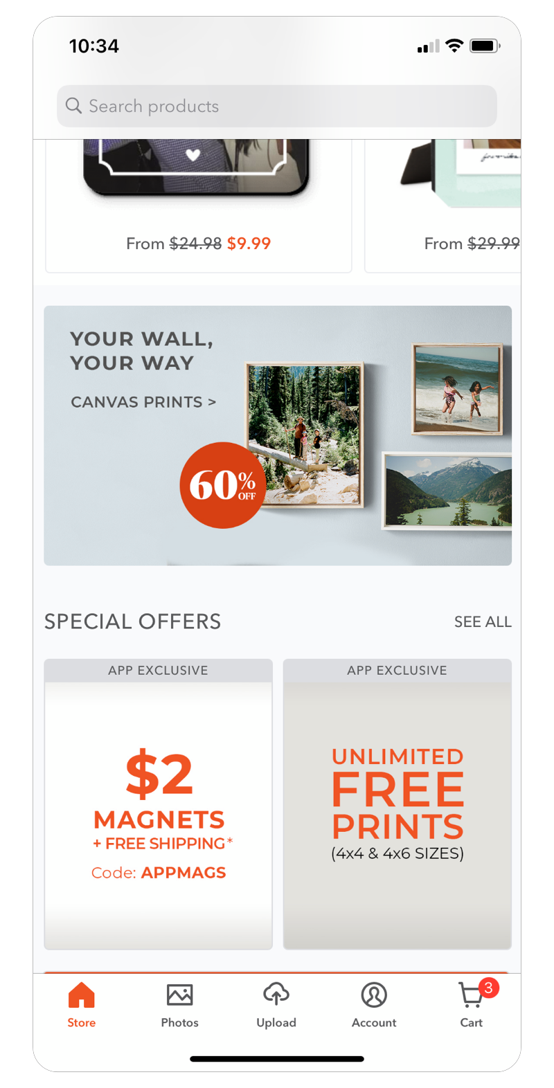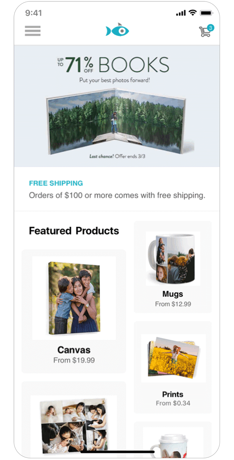 Amongst the most accessed sections of the app. Access to cart is within the global nav along with access to Shop and Photos.