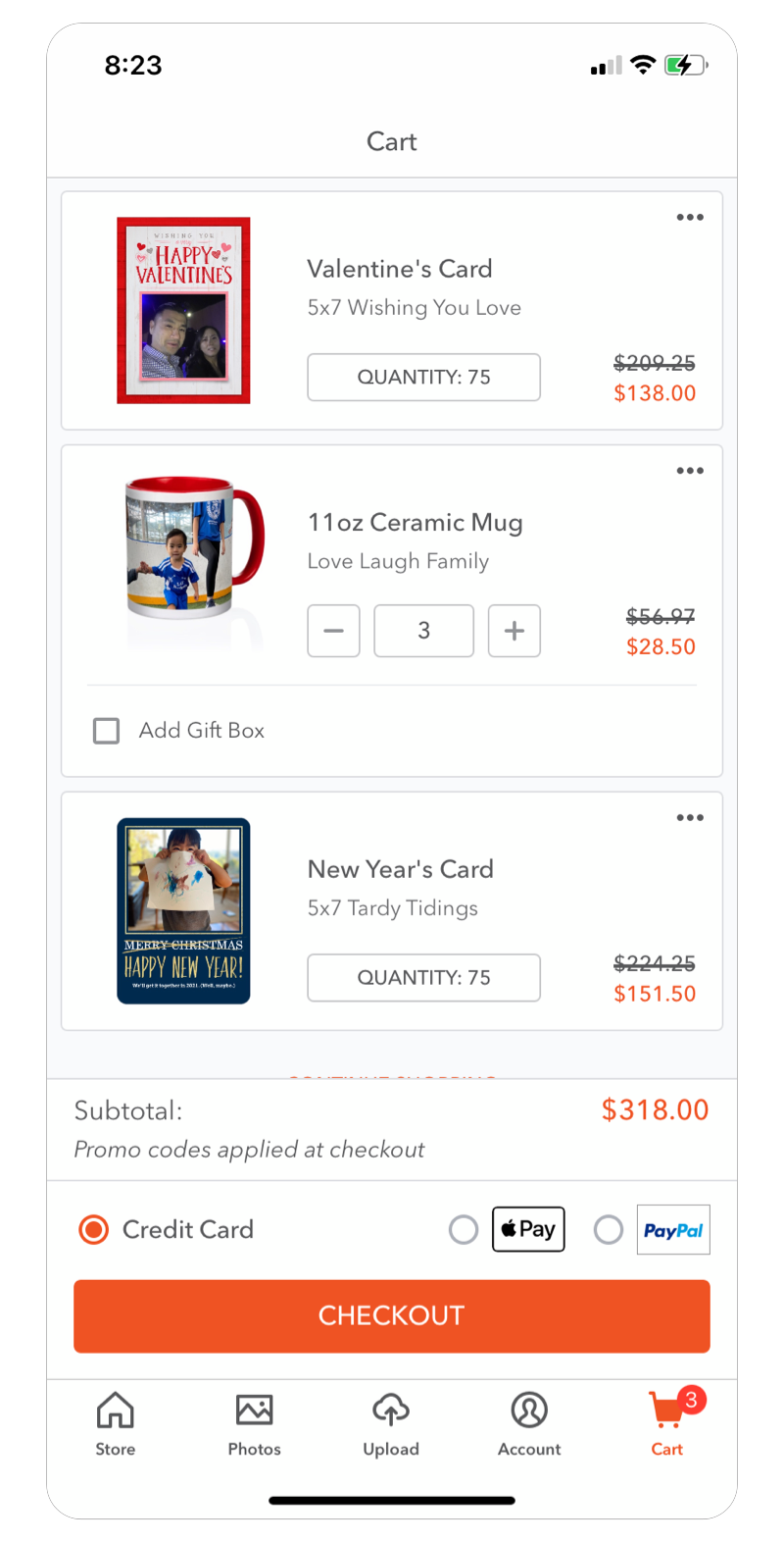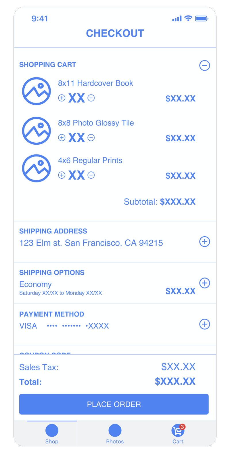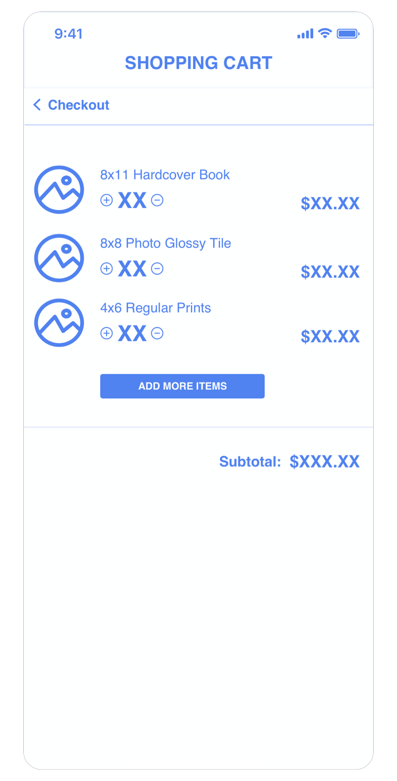 My initial insights of every screen throughout the process of placing a 4x6 Prints order.