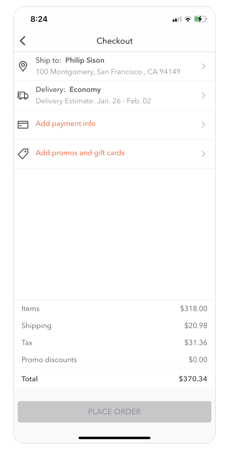 Order details preview and compartments of shipping address, delivery, payments and gift card promos.