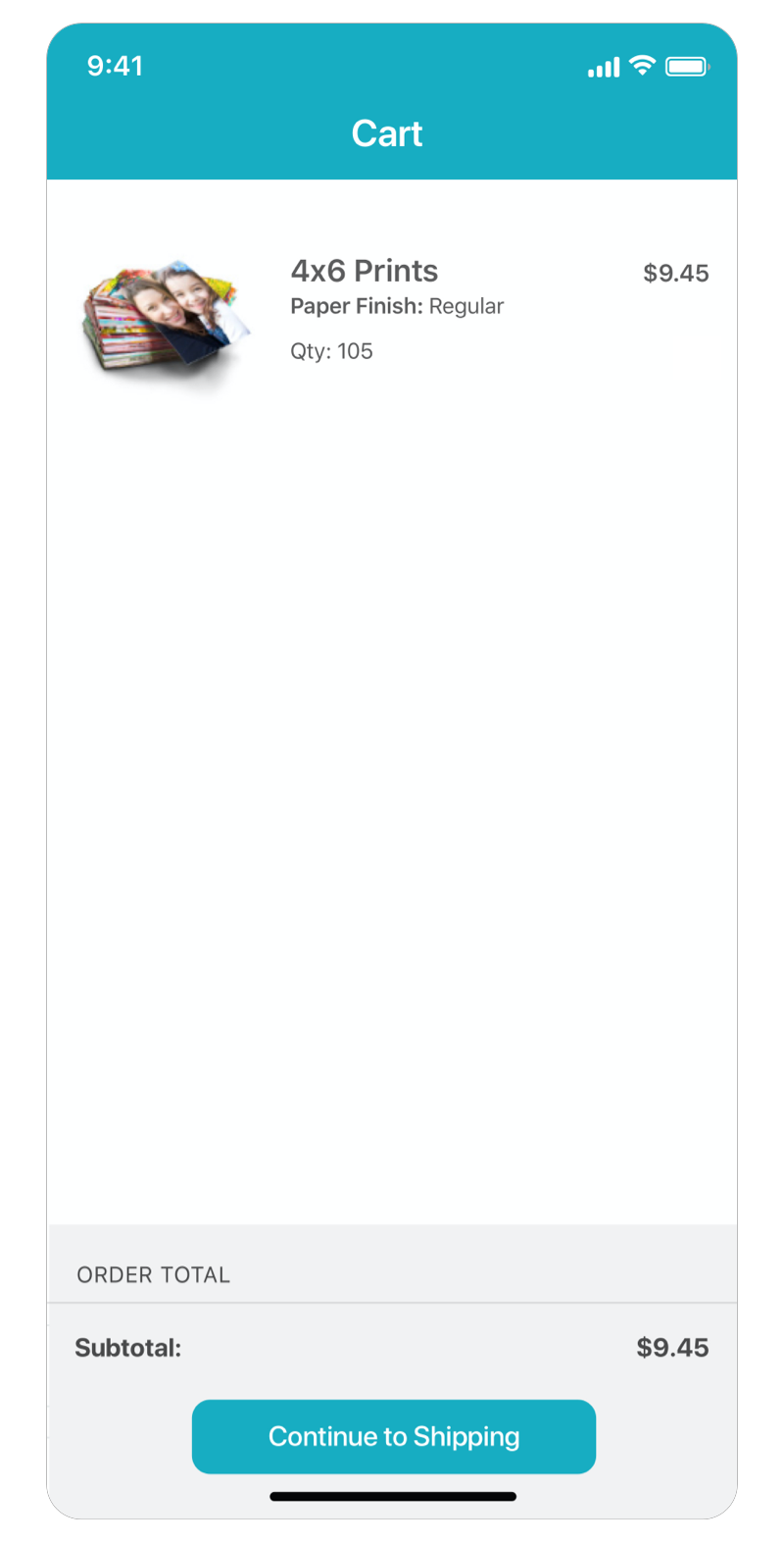 I landed on this screen after finalizing my 4x6 Prints. It seems to be a one way road with a single CTA, "Continue to Shipping."
