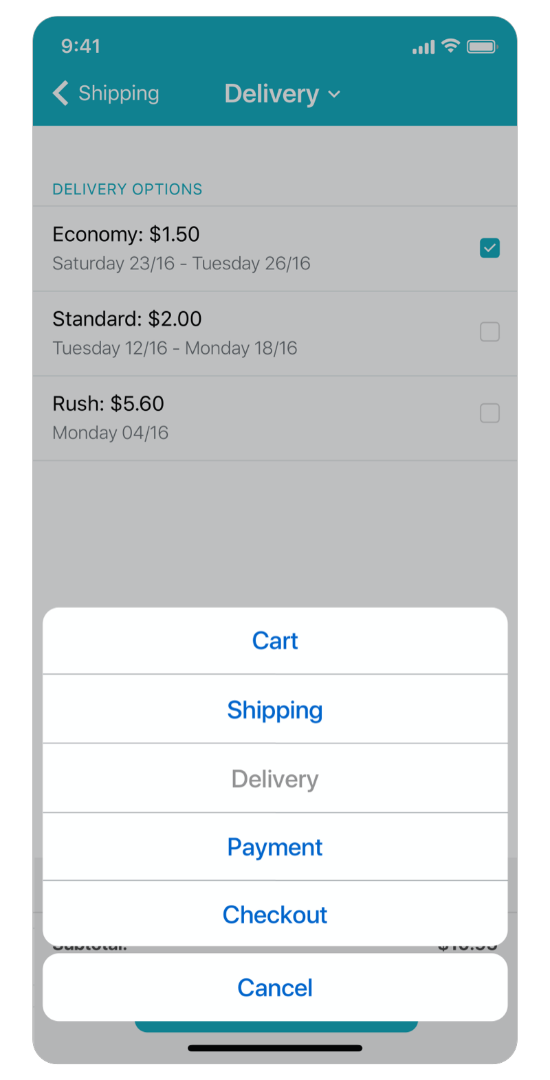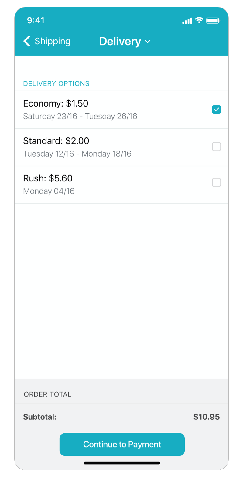 I have three delivery price options with estimated delivery dates. A selection automatically adds to the order subtotal.