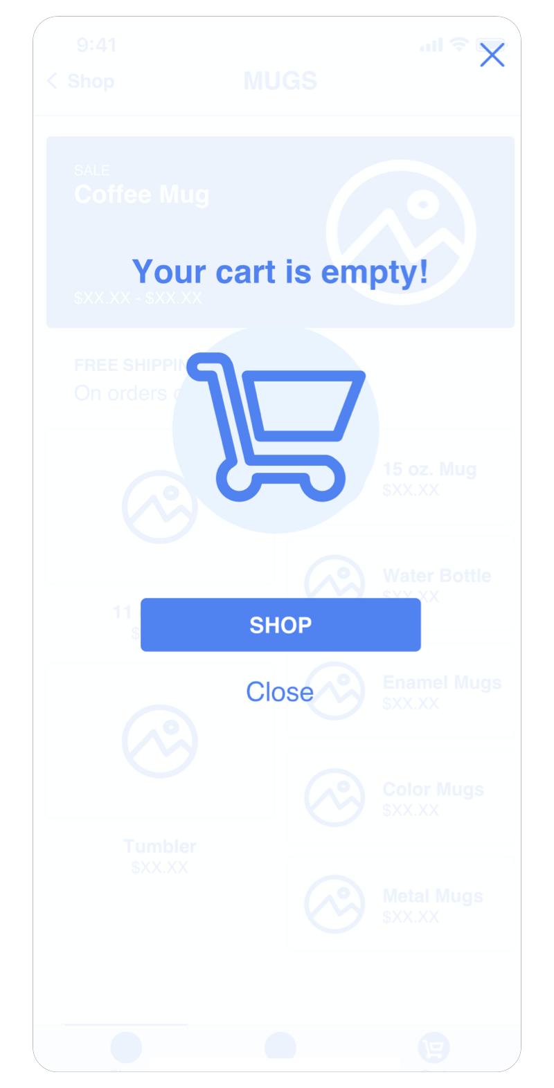 When an empty cart is accessed, a modal appears prompting users to either shop or close the window.