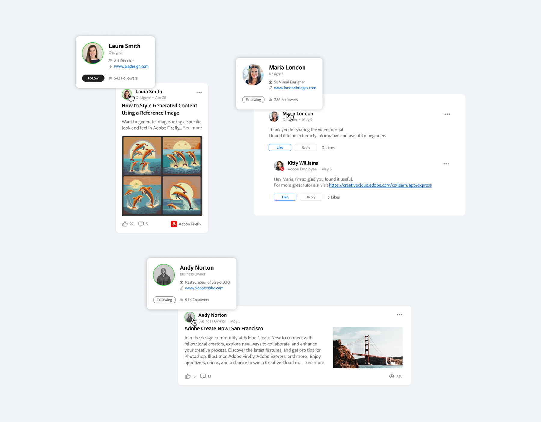 For authenticity, we’ve included the author’s avatar and screen name in the posts. Additionally, we’ve incorporated an overlay profile card that appears when the author’s name is hovered over. This feature provides a brief overview of the user’s profile, enabling meaningful connections to be made.